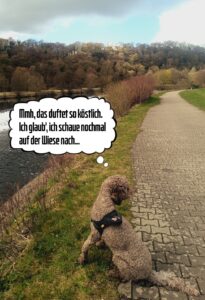 Ich saß lange dort und dachte nach. Ich wollte mich ins Wasser stürtzen und das Bällchen holen. Aber dann – ein Duft. Zart, würzig, unwiderstehlich. Die große weite Wiese rief.