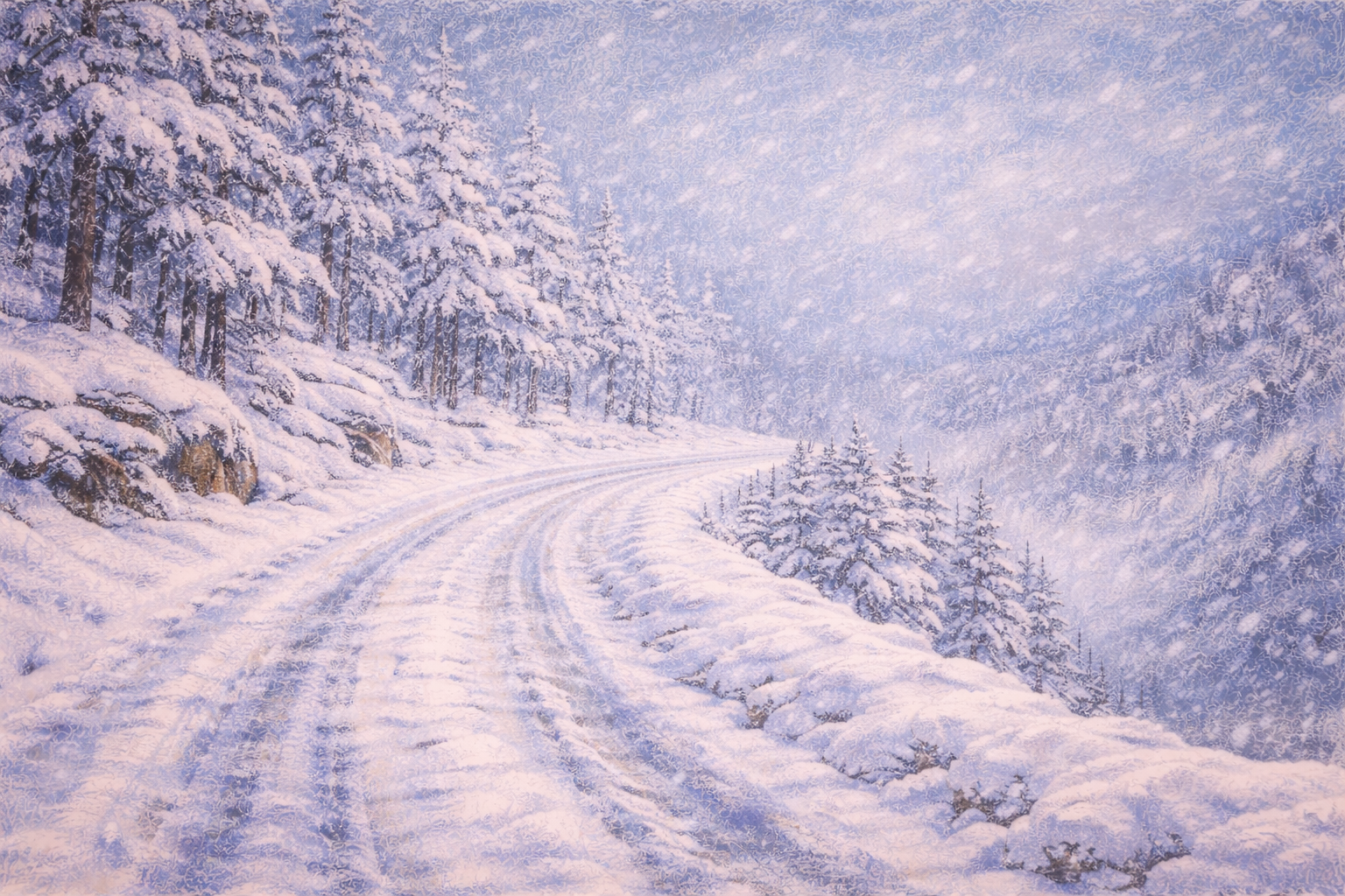 Kaum waren sie auf der Straße, begann der Wald. Links stiegen die Stämme dicht auf, dunkel und reglos. Oben auf den Kronen türmte sich der Schnee. Rechts fiel das Gelände ab, nicht sofort, nicht spektakulär, aber sichtbar: ein Hang, der sich in Weiß verlor, tiefer und tiefer, bis die Konturen verschwammen. Der Schnee lag schwer auf den Ästen. Er fiel nicht; er wartete nur.