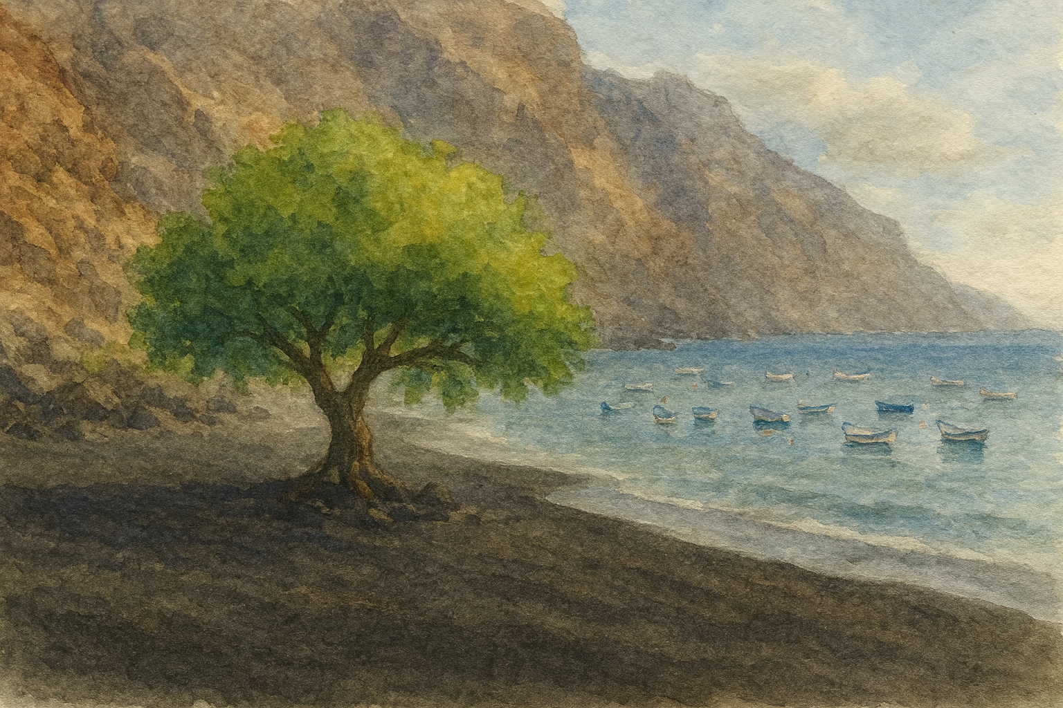 […] Frederike setzte sich unter die Zeder, zog die Knie an die Brust und starrte hinaus aufs Meer. Das rhythmische Rauschen der Wellen, dieses ewige Kommen und Gehen, schenkte ihr einen kurzen Moment der Ruhe. Der Wind strich ihr durchs Haar und trug den fernen Klang einer Gitarre zu ihr herüber, kaum hörbar, aber da. Wie eine Erinnerung, verborgen hinter einem Schleier.